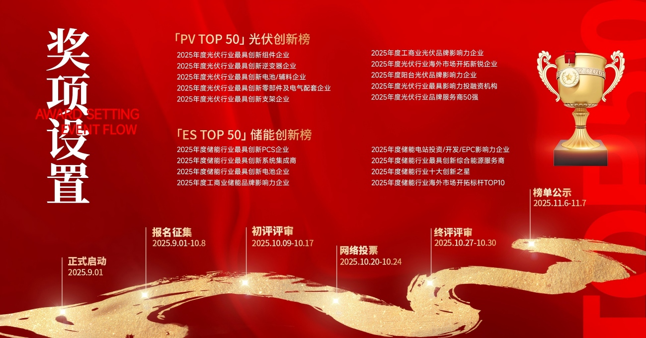 “「PV TOP 50」&「ES TOP 50」2025光儲(chǔ)創(chuàng)新榜”評選活動(dòng)正式啟幕!